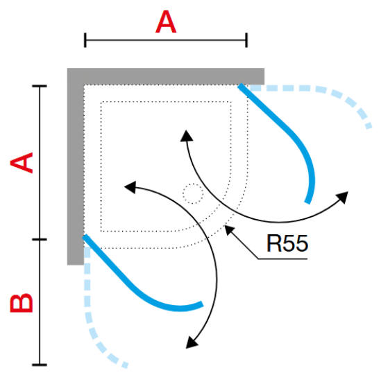 two semi-frameless curved glass doors - each hinging from adjacent